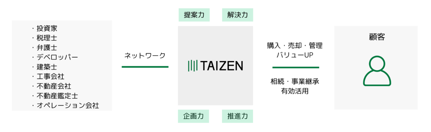 私たちタイゼンの存在意義は、より多くの方々が不動産を通して泰然自若な環境を備えて頂くことです。それにより社会や未来の選択肢が広がりより良い方向になる事を信じています。そのために、私たちは立ち止まらず新しいことやデジタル活用など積極的に取り入れ、挑戦し、新しいサービスを提供できるようにいたします。古くからの良い事を学び・大切にし、固定概念にとらわれず、ワクワクするイノベーションを起こすことが私たちのミッションです。
